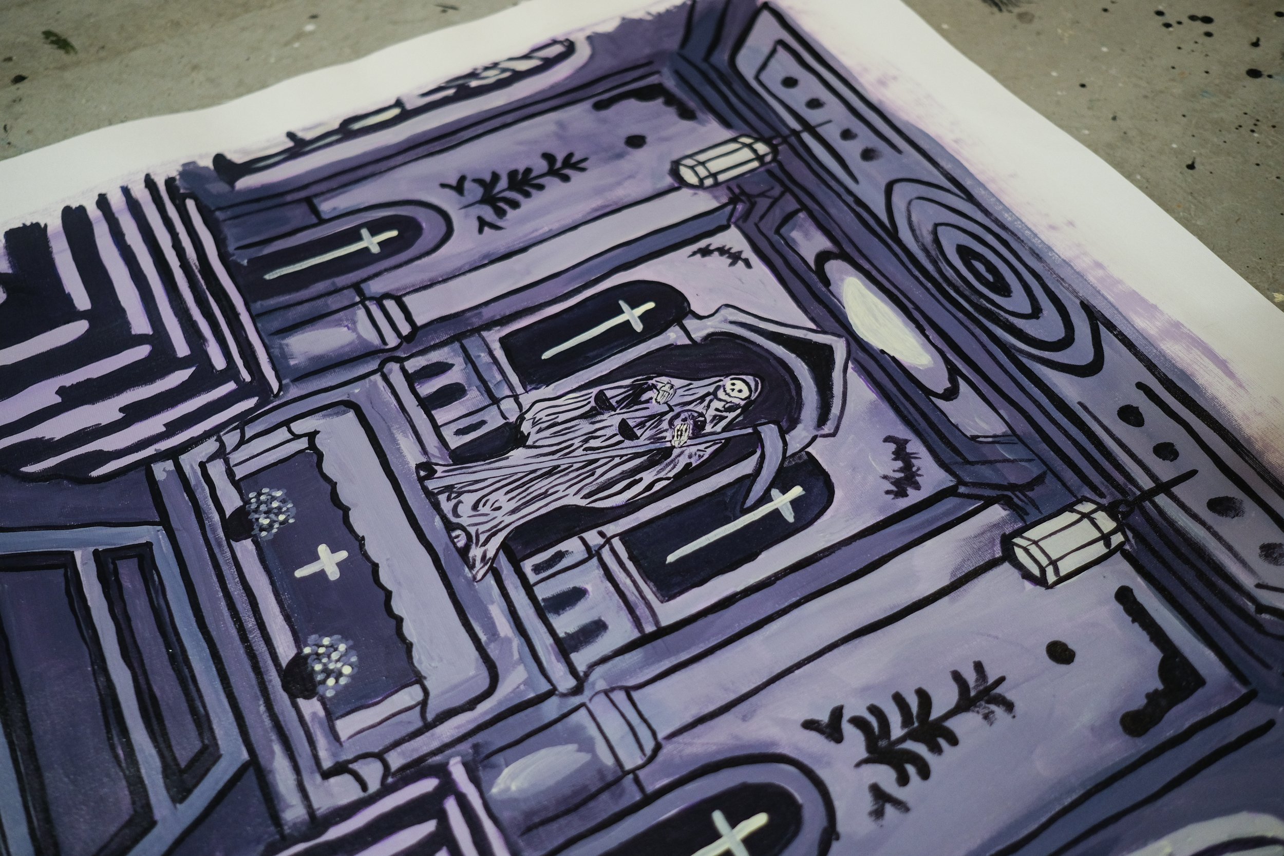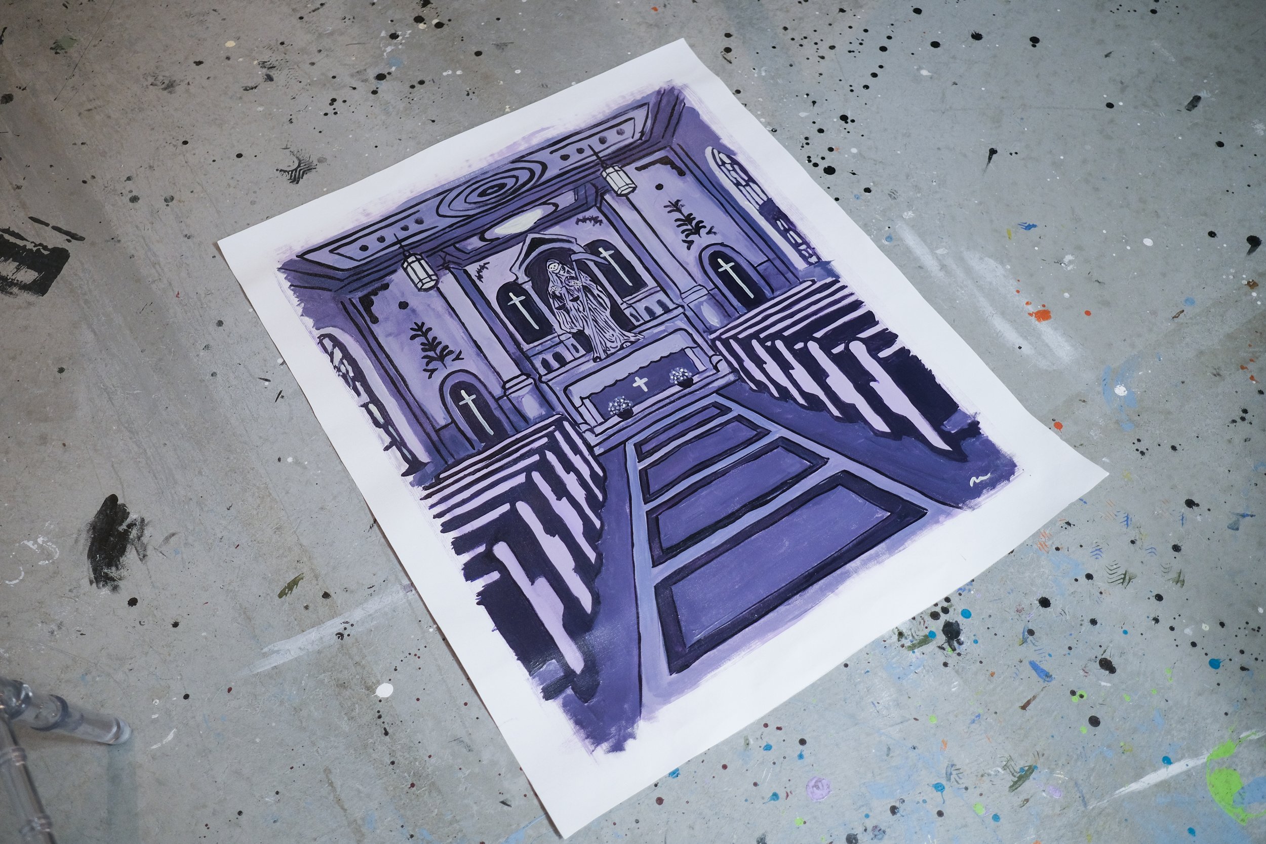 The painting itself is acrylic on canvas. I began with a mockup using a reference photo I took of a church in Atlantic City. I wanted the structure to feel familiar and grounded, while the symbolism challenged what that space represents. I used acrylic paint, paint markers, and invested in fine lining brushes to achieve clean, intentional lines. The process was slow and deliberate. Every mark felt like an act of care and resistance.