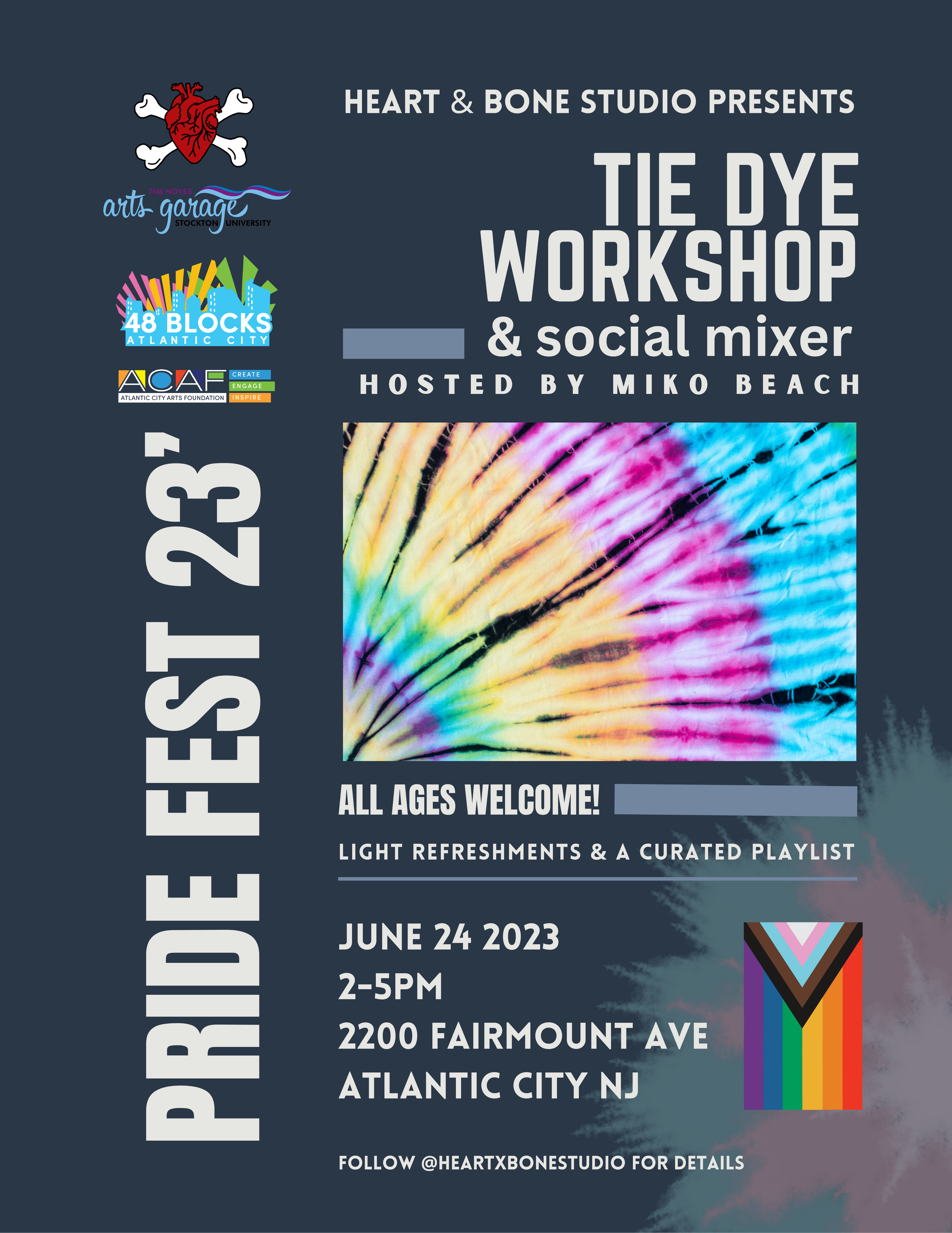 Join us for a vibrant tie-dye workshop and social mixer as we celebrate Pride Month during the 48 Blocks Atlantic City celebration! Organized by the Atlantic City Arts Foundation, this event is set to take place on June 24th from 2-5pm at the Noyes Arts Garage of Stockton University, with the talented Miko Beach as our host.
